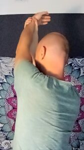 • lewa ręka wyciągnięta, dłoń skierowana wnętrzem do góry, prawa ręka ciągnie lewą po skosie w górę. Chwyt powyżej łokcia. Potrzymaj przez 20-20 sekund i zamień ręce. Wykonaj kilka razy.