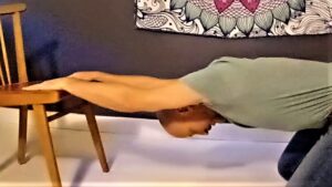 • uklęknij przed krzesłem i połóż ręce na siedzeniu. Głowa w dole, pochylaj ją do momentu odczucia nacisku na mięśnie. Utrzymaj i zrób 6-7 głębokich wdechów.